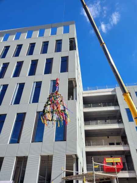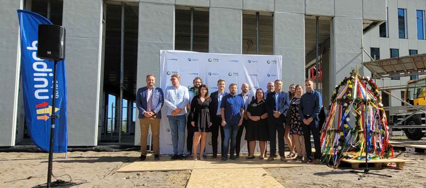 Tertio Ponte is a modern office and service complex being constructed by Unibep in Włocławek. After ten months of construction, the building has reached its intended height, signifying the completion of this construction stage. The traditional wreath was hung 25 metres above the ground.
