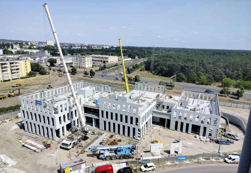 We Włocławku, w rejonie ulic Kruszyńskiej i Broniewskiego, Unibep buduje nowoczesny biurowiec o nazwie Tertio Ponte. Prace na budowie trwają już od kilku miesięcy. Aktualnie kadra budowy realizuje konstrukcję prefabrykowaną obiektu. – Dzięki tej technologii dziennie montujemy nawet kilkadziesiąt elementów prefabrykowanych – wyjaśnia Adam Klimczak, Kierownik Kontraktu Unibep.