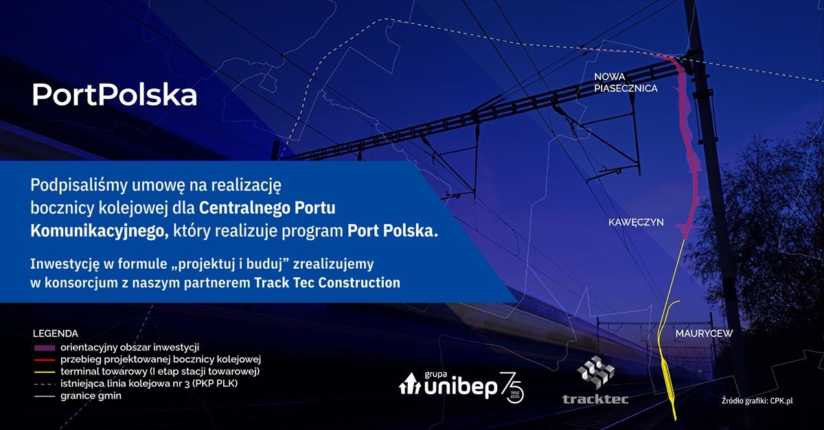Konsorcjum w składzie Grupa Unibep oraz Track Tec Construction podpisało z Centralnym Portem Komunikacyjnym (CPK), który realizuje program Port Polska, umowę o wartości 143,2 mln zł brutto na zaprojektowanie i budowę bocznicy kolejowej wraz z robotami towarzyszącymi. Wartość zakresu przypadającego na Grupę Unibep wynosi 71,6 mln zł brutto.