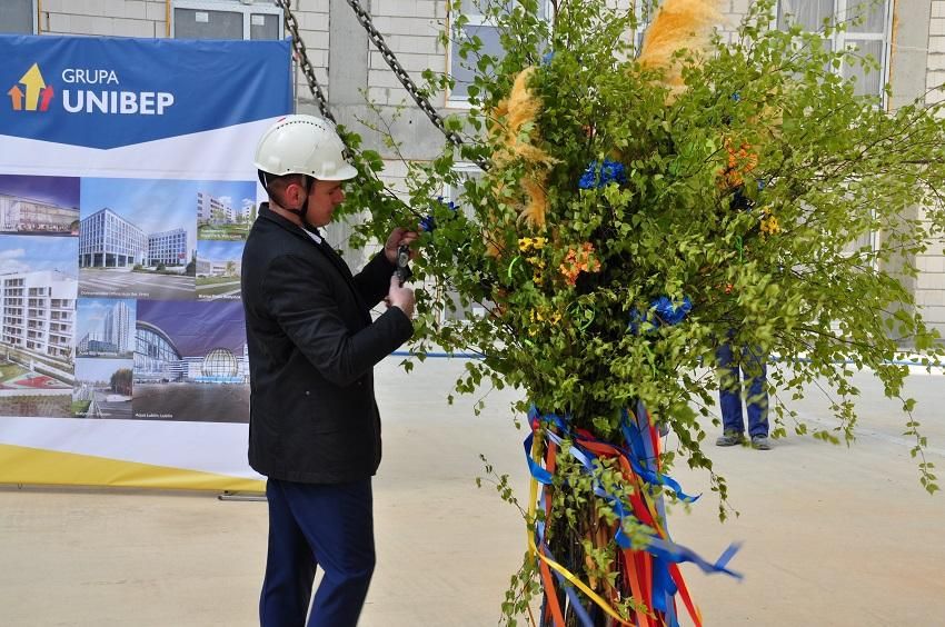 Hanging a symbolic wreath is a tradition in the construction industry. It is customary when finishing an important phase of building , adding the last element of the roof structure. The construction of Ronda Wiatraczna began in the first half of 2016, this is a unique investment in an extraordinary place. The ceremony was attended by almost 300 people. They were, among others, representatives of the investor, designers, architects, contractors, business partners, city authorities, and media representatives. Despite the cold, the atmosphere was warm, cheerful, and everyone was in a good mood. In order for the tradition to be fulfilled, the wreath was consecrated by the clergy of Orthodox and Catholic parishes. Completion of the construction of Rondo Wiatraczna is planned for the fourth quarter of 2017. In the photo: Rafał Grzymałowski, construction manager, hangs the symbolic wreath.
