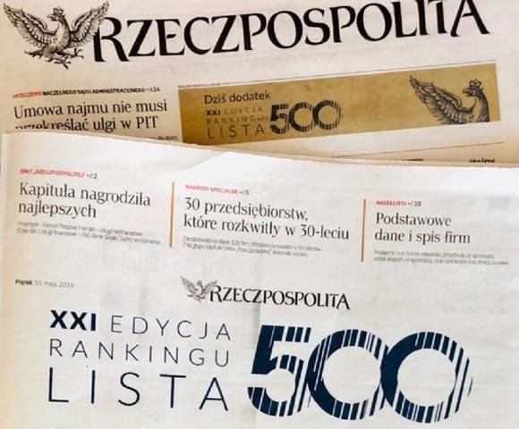 The XXI edition of the Rzeczpospolita daily newspaper “List of 500”, presenting the largest Polish companies in terms of revenues for 2018, was published on 31 May 2019 and it was combined with award of prizes to the distinguished enterprises.